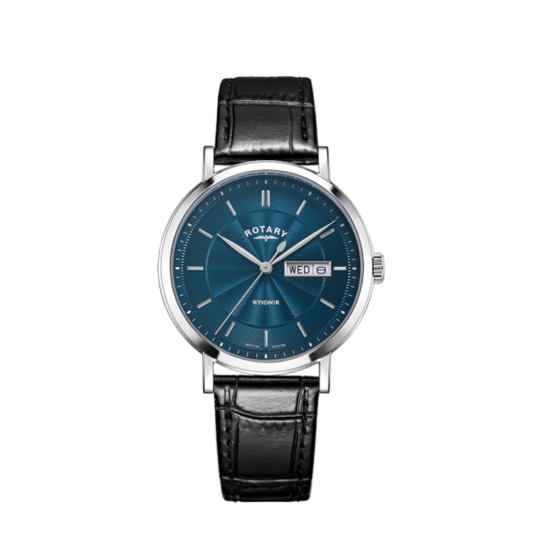 Crafted with a stainless steel 37mm case, black leather strap, as well as strong sapphire glass, this traditional Windsor timepiece features silver baton indices over a blue guilloche dial. Water resistant to 100m, this classic watch is powered by quartz and displays a day/date window.
