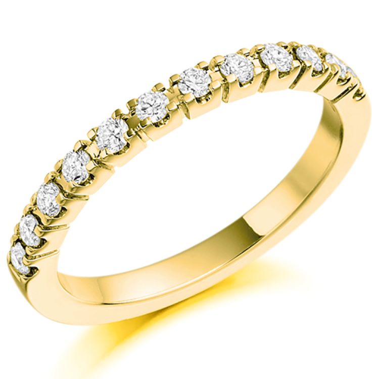 4-claw set, 12x brilliant cut diamond, 2.1mm wide Half Eternity Ring. 45% diamond coverage, total diamond weight 0.33ct, Colour G-H, Clarity SI Available in 9ct, 14ct & 18ct Yellow, White or Rose Gold, Platinum and Palladium Please contact us before placing your order to discuss the size required and delivery timeframe.