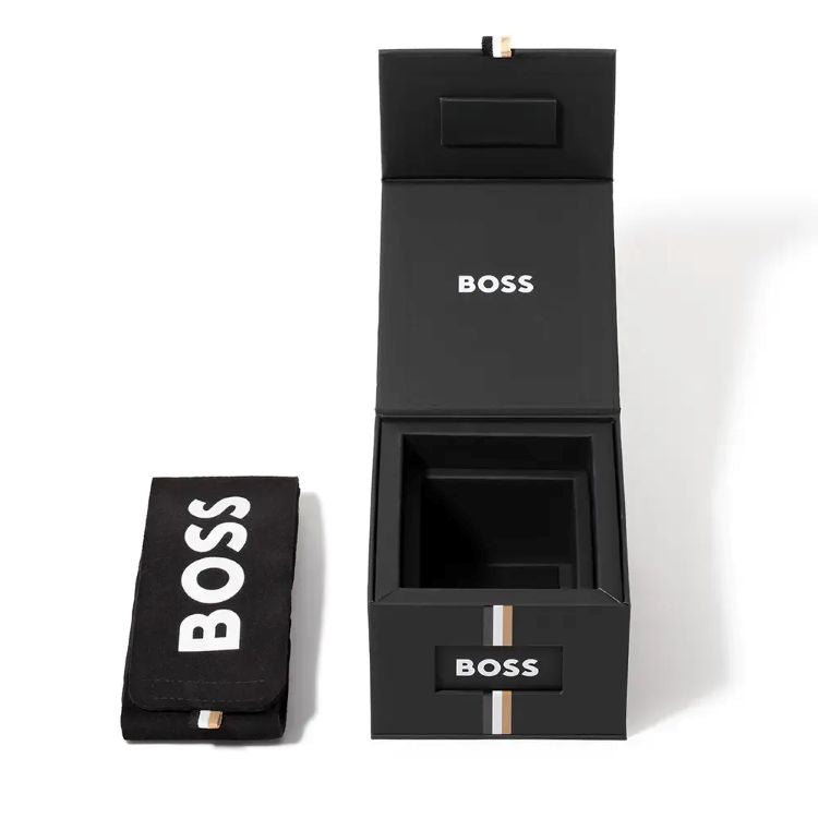 BOSS Grand Prix 44mm stainless steel bracelet watch. Polished and brushed finish, blue 44.50 case diameter with index, quartz movement and water resistant up to 50m.