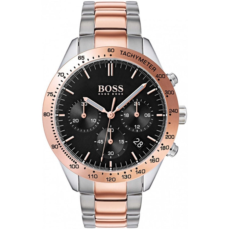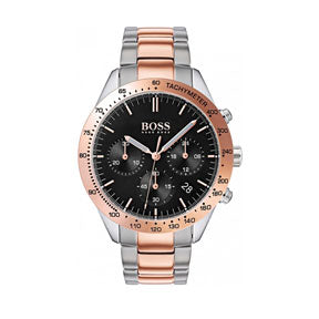 Boss Watches - Talent - Men's Rose Gold-plated & Stainless Steel bracelet watch. Round black sunray brush 42mm dial, rose golden baton hour markers & hands. Three sub-dial chronograph function, date window display between 4 & 5 o'clock & golden tachymeter bezel. Water Resistant 50m.
