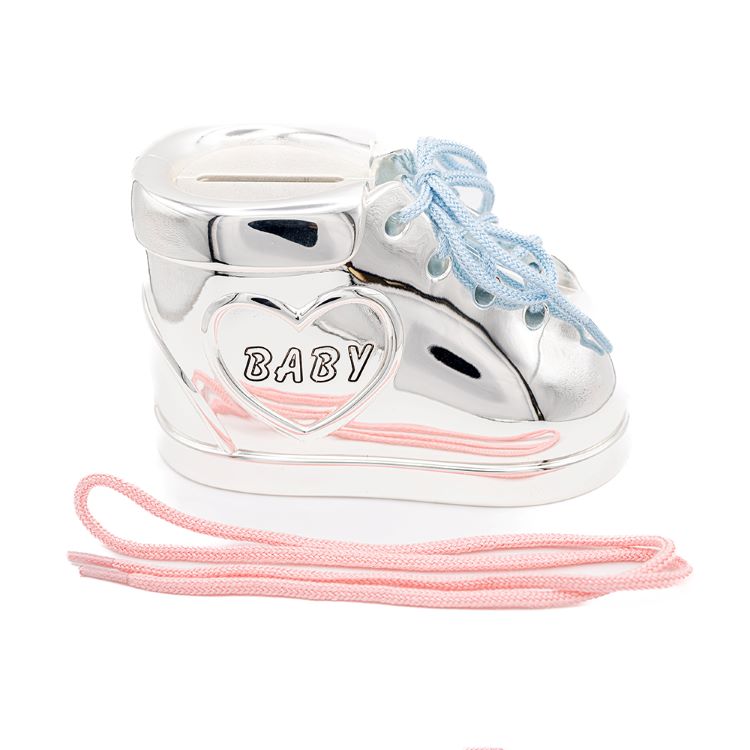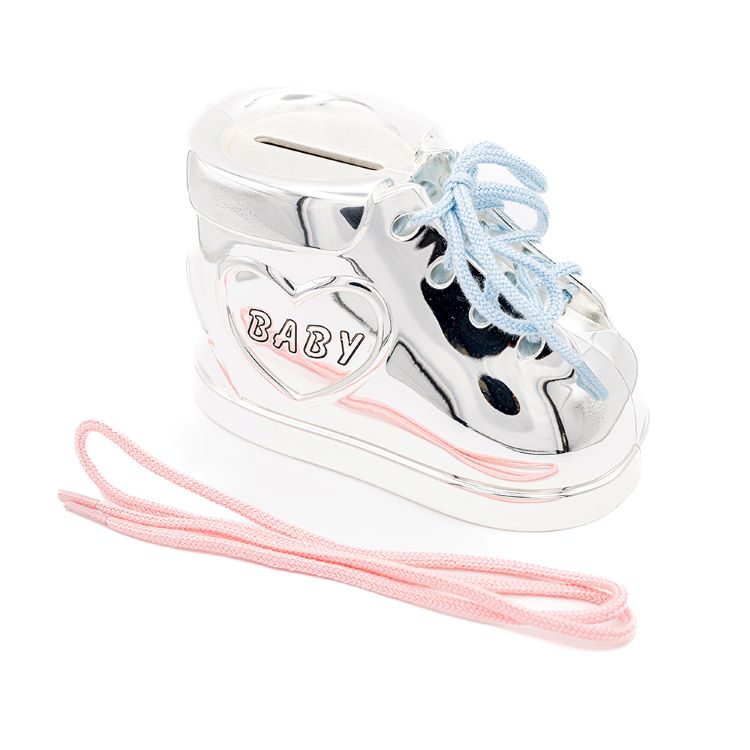 EP silver baby boot money box with interchangeable blue and pink lace.