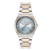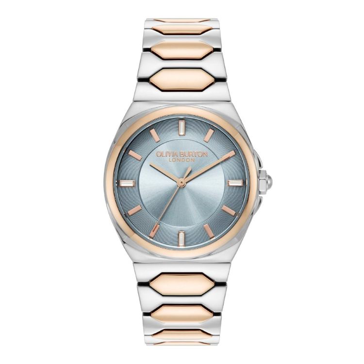 Ladies Olivia Burton Lustre two-tone rose gold ionic plated stainless steel bracelet watch. Blue dial, quartz movement and water resistant up to 30m.
