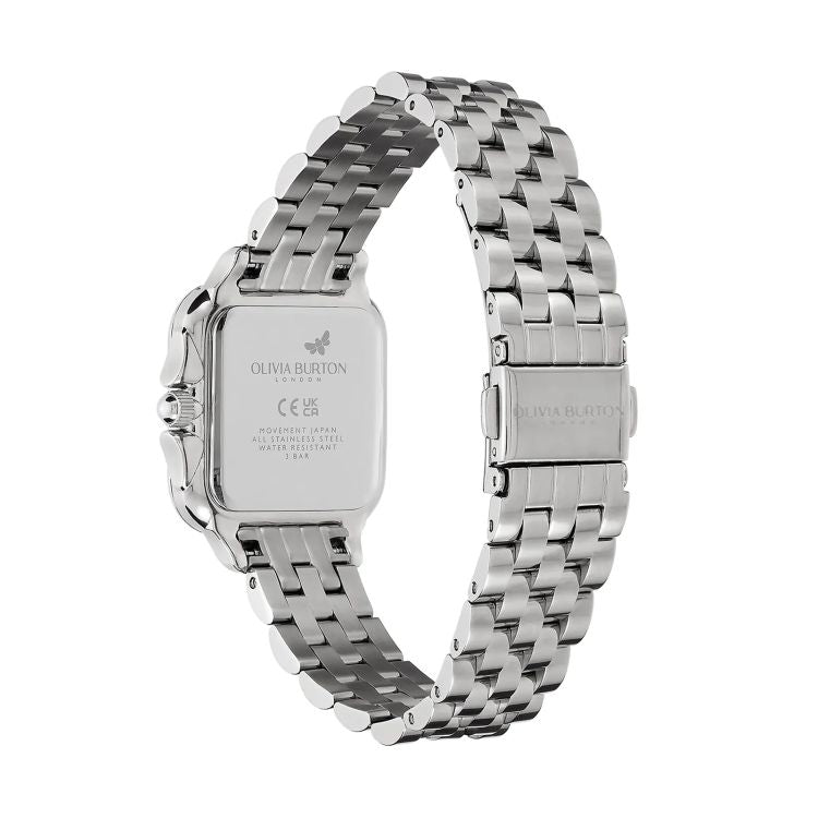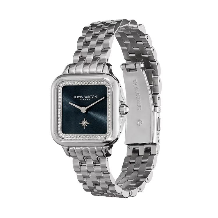Ladies Grosvenor Olivia Burton stainless steel bracelet watch. Blue sunray dial, quartz movement, crystal mineral glass and water resistant up to 30m.