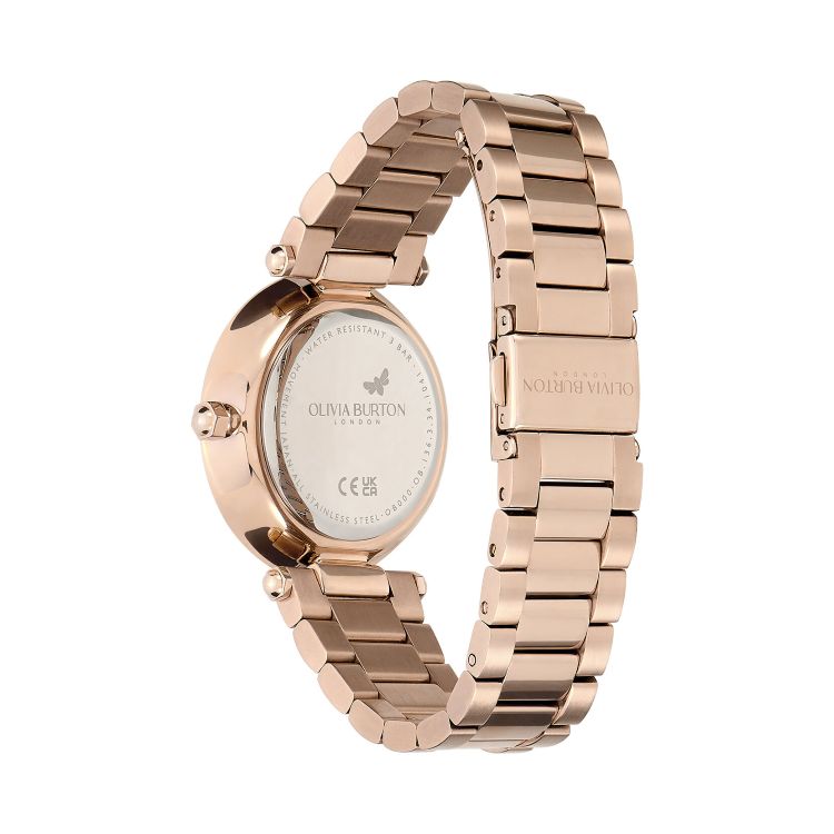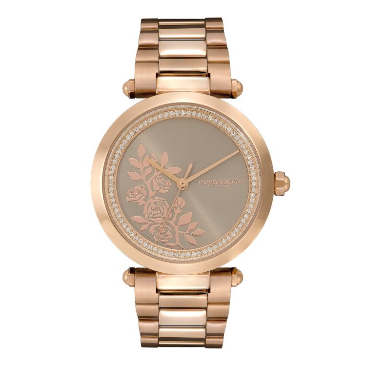 Ladies Olivia Burton T-bar floral watch. Rose gold ionic plated stainless steel case and link bracelet. Water resistant up to 30m.