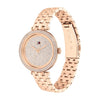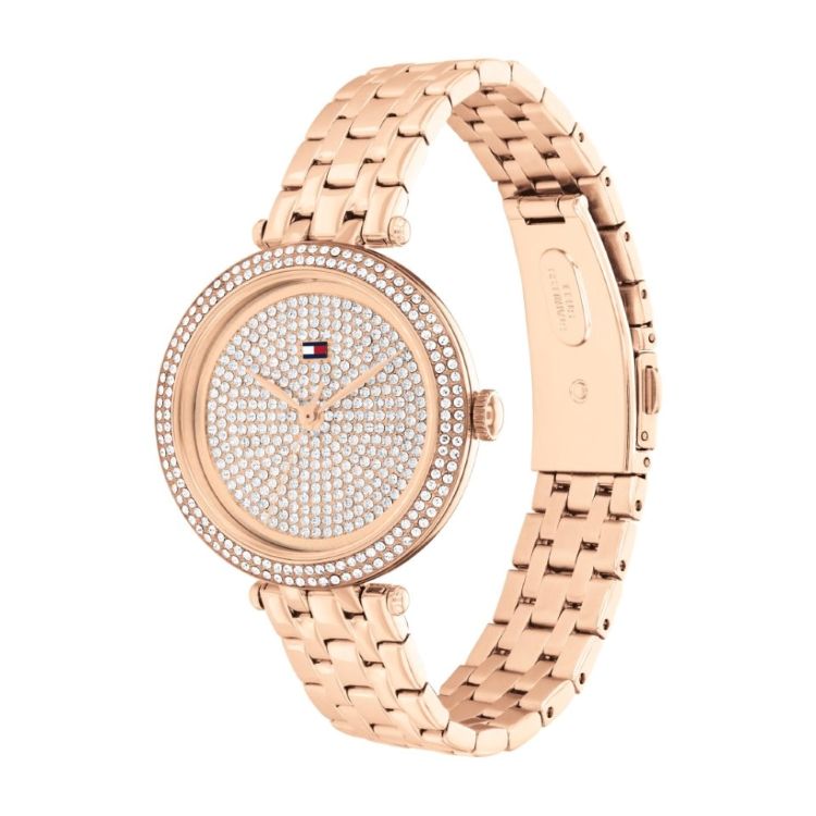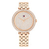 Ladies Tommy Hilfiger Natalie ionic rose gold plated stainless steel bracelet watch. Crystal pave set index, quartz movement, round 34 mm case and water resistant up to 30m.