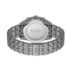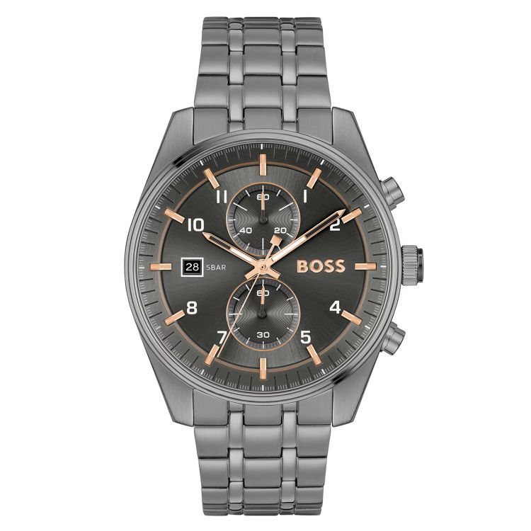 BOSS Mens SkyTraveller grey stainless steel bracelet watch. Grey dial with two sub-dials and a date aperture at 9 o’clock. Quartz movement and water resistant up to 50m.