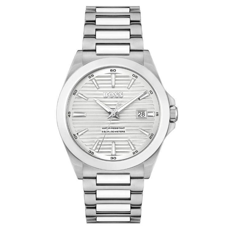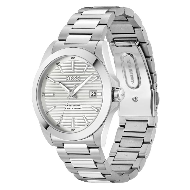 BOSS Mens Strike stainless steel bracelet watch. Textured silver dial with a date aperture at 3 o’clock. Quartz movement and water resistant up to 50m.