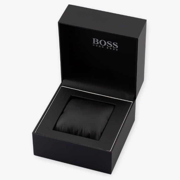 Mens BOSS Admiral watch. Stainless steel bracelet chronograph. Round blue 46mm dial, white baton markers & hands. Blue bezel. 3 sub-dials showing seconds and minutes. Date window display between 4 and 5 o'clock. Water resistant 100m.