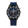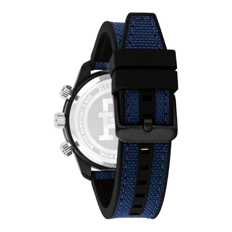 Mens TH85 Tommy Hilfiger black ionic plated stainless steel, blue cordura and black silicon bracelet watch. Navy blue dial, case diameter 40mm with index, quartz chronograph movement and 50m water resistance.