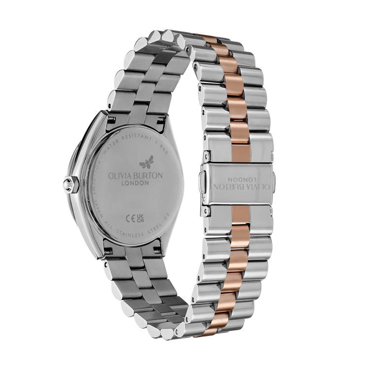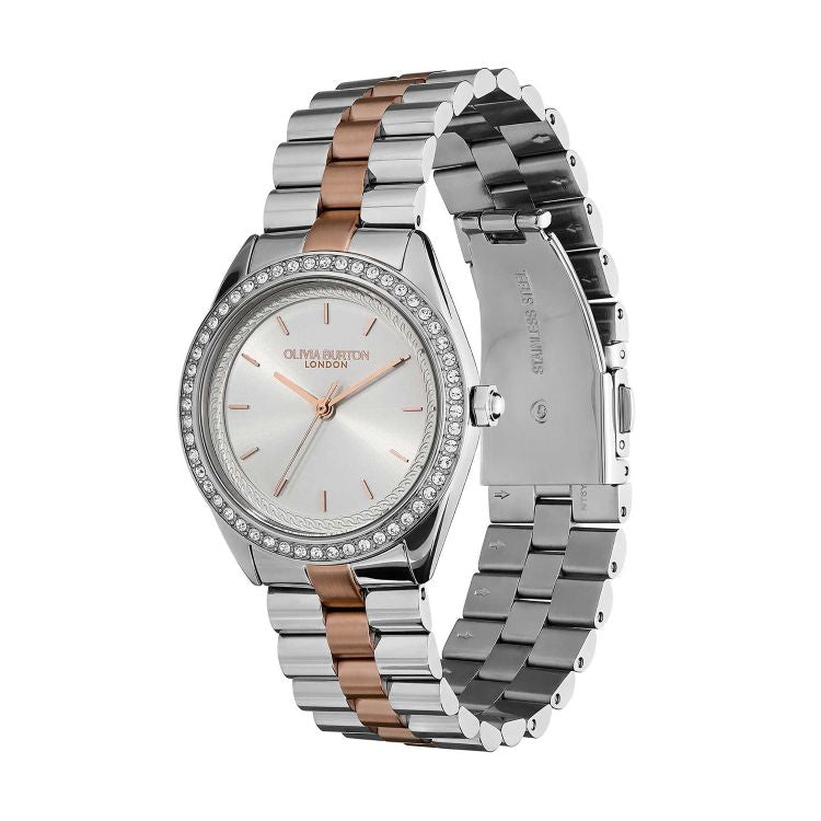 Bejewelled Olivia Burton stainless steel and rose gold ionic plated bracelet watch. Quartz movement and water resistant up to 30m.