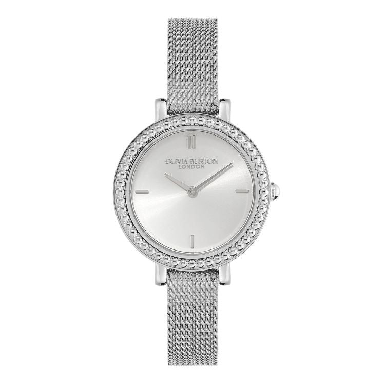 Olivia Burton ladies Vintage Bead stainless steel bracelet watch. Silver dial with beaded bezel, quartz movement and water resistant up to 30m.