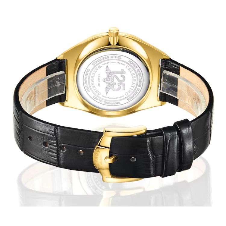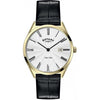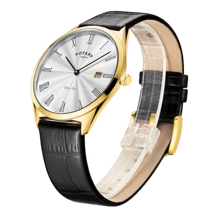 Rotary Gents Quartz powered Ultra Slim watch.Features a 38mm Round Gold PVD Plated Stainless Steel case and black leather strap for timeless sophistication. Its silver dial displays black Roman numeral markers and a clear date window, all under the sturdy protection of sapphire glass. Water Resistant up to 50M.