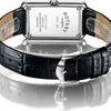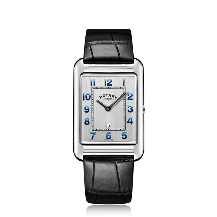 Rotary Men's Cambridge Stainless Steel black leather strap watch. Rectangular 42x28.5mm silver dial & Blue arabic hour markers & black hands with date window display above 6 o'clock. Water Resistant 50m.