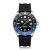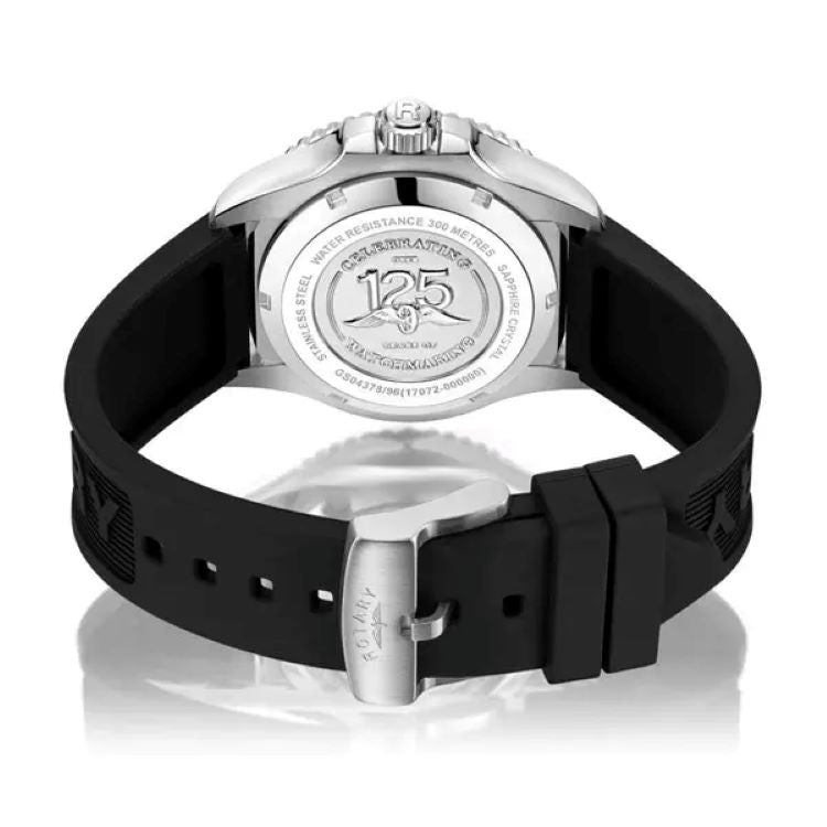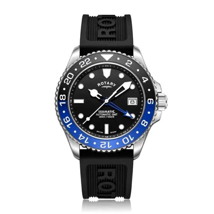 Rotary mens Seamatic Automatic diving watch. Stainless steel case, black silicone strap, automatic movement and water resistant up to 300m.