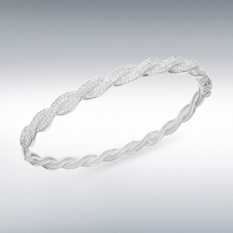 Sterling silver ladies hinged cubic zirconia set twist bangle.