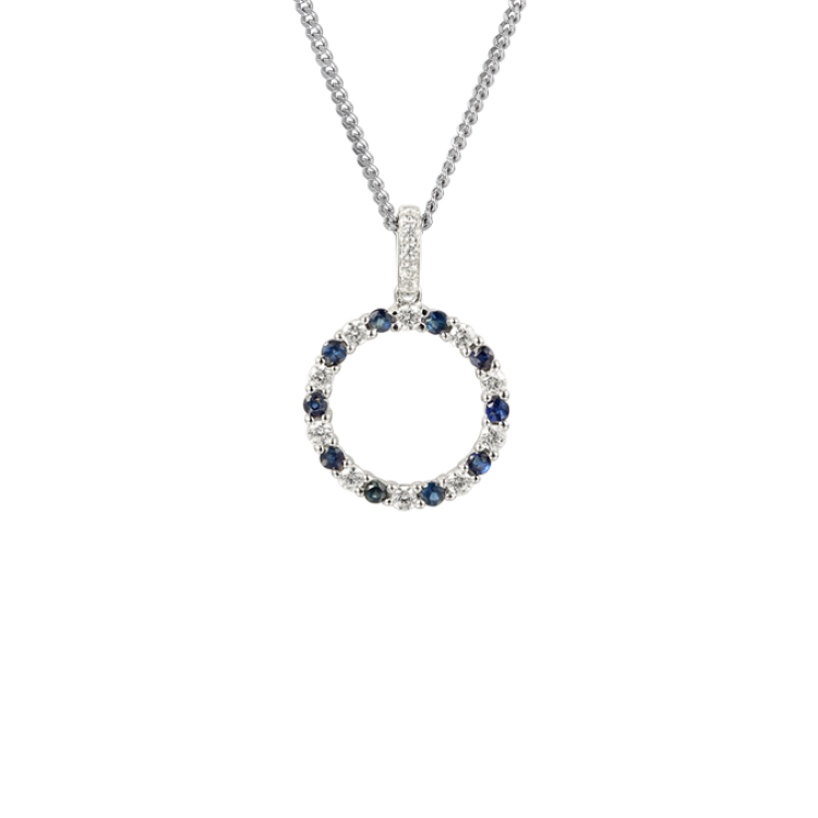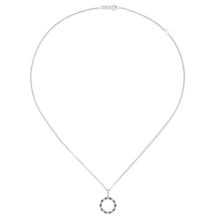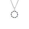 Sterling silver round cut sapphire and cubic zirconia open circle 16"-18" adjustable necklace.