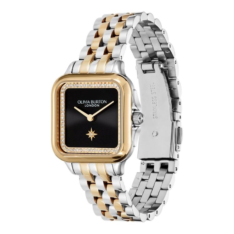 Olivia Burton Grosvenor two-tone stainless steel bracelet watch. Black square dial set with crystals, quartz movement and water resistant up to 30m.