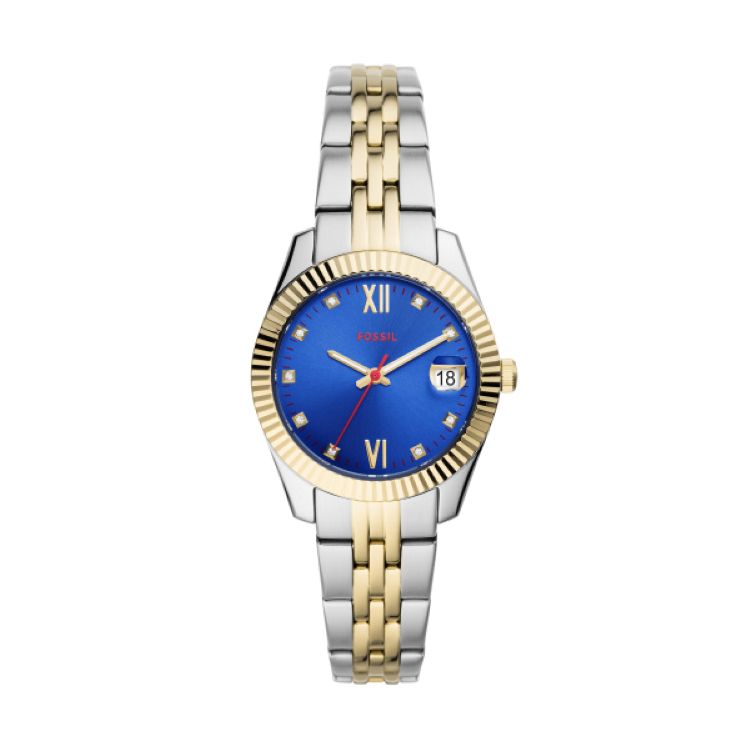 Wommen's hard wearing stainless steel and yellow gold ion plated case and bracelet watch. This watch features a vibrant blue coloured dial.